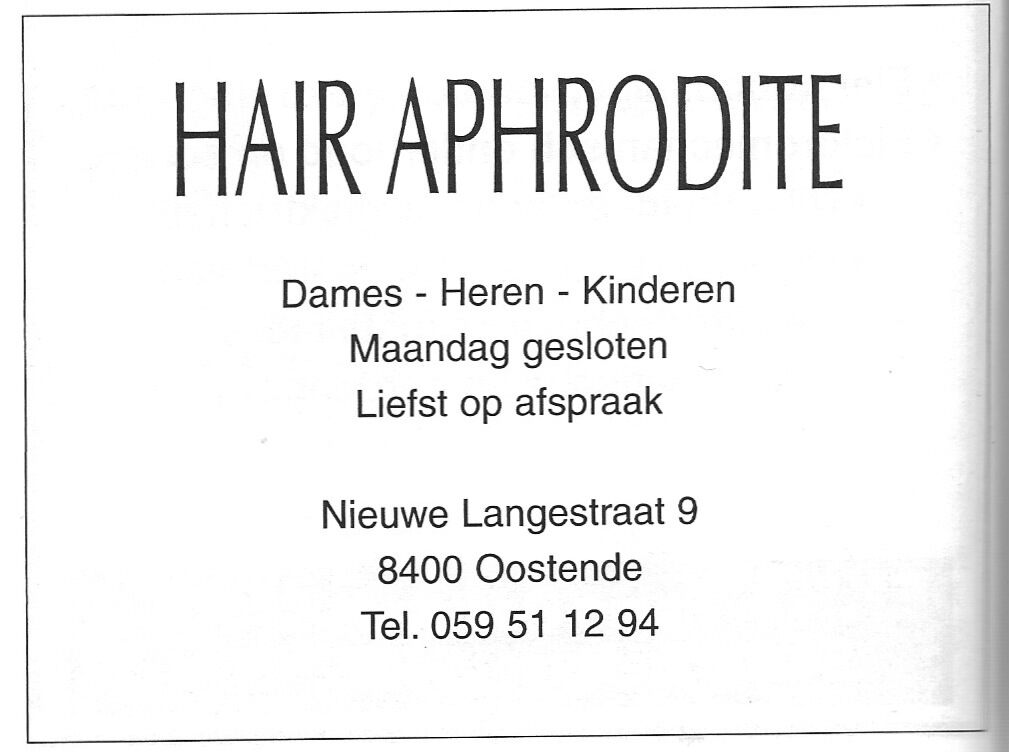 Trefwoorden ADVERTENTIES ; LICHAAMSVERZORGING HAIR APHRODITE (KAPSALON) NIEUWE LANGESTRAAT Plaatskenmerk MUSEUMDEPOT 117.7 A14 D2 Deelbeschrijving uit boek of document Programma : Mo gow zeg 2006 Pagina 26 Print