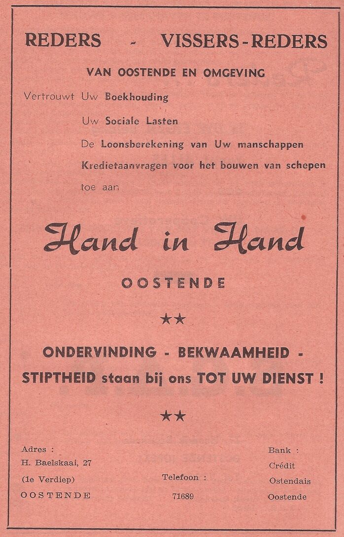 Reders - Vissers-Reders van Oostende en omgeving. Vertrouwt uw boekhouding. Uw sociale lasten. De loonsberekening van uw manschappen. Kredietaanvragen voor het bouwen van schepen toe aan Hand in Hand. Oostende. Ondervinding. Bekwaamheid. Stiptheid staan bij ons tot uw dienst !