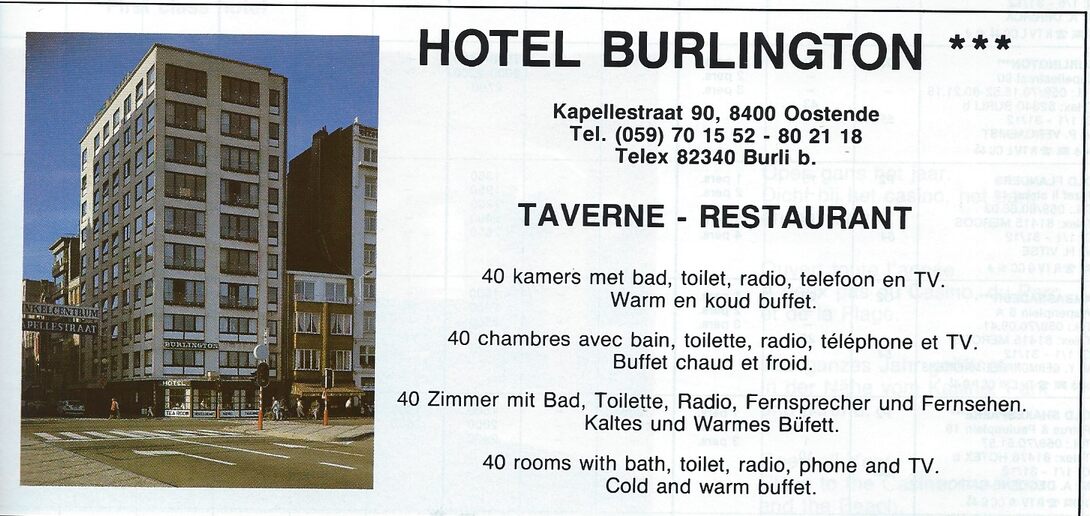 Trefwoorden ADVERTENTIES ; HORECA HOTEL BURLINGTON HOTELS (HEDEN) KAPELLESTRAAT Plaatskenmerk A334 Deelbeschrijving uit boek of document Oostende 88 1987 Pagina 55 Print
