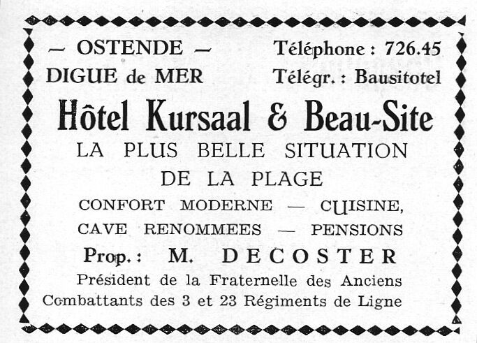 Omschrijving Hotelier : Firmin Decoster. Hij was ook voorzitter van de "Broederbond der Oudstrijders der 3de en 23ste Linieregimenten" Trefwoorden ADVERTENTIES ; HORECA HOTEL KURSAAL & BEAU SITE DECOSTER FIRMIN (HOTELIER) HOTELS (OUDE) ALBERT I PROMENADE Plaatskenmerk B207 Deelbeschrijving uit boek of document Tiende verjaring van de Broederbond der Oudstrijders der 3de en 23ste Linieregimenten 1929-1939 = Dixième anniversaire de la Fraternelle des anciens combattants des 3e et 23e régiments de Ligne 1939 Print