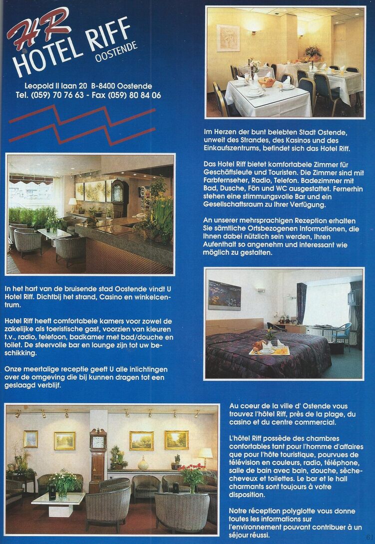 Trefwoorden ADVERTENTIES ; HORECA HOTEL RIFF LEOPOLD II-LAAN HOTELS (OUDE) Plaatskenmerk C698 Deelbeschrijving uit boek of document Oostende [93] 1993 Pagina 61 Print