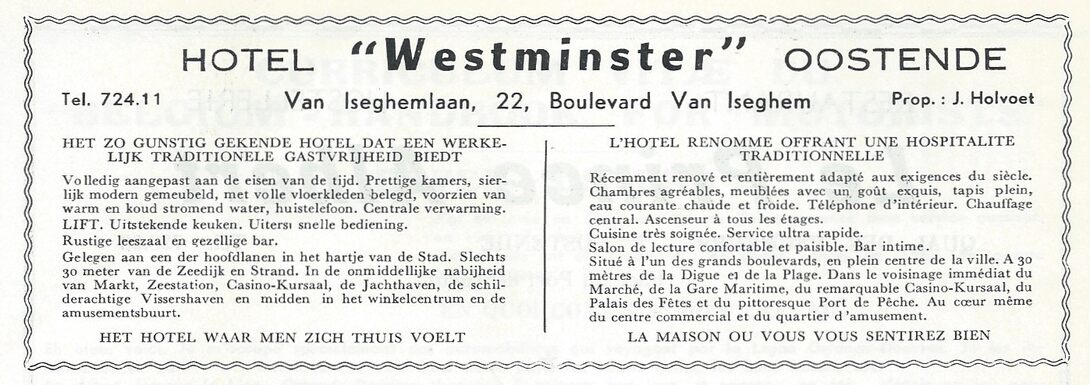Omschrijving Uitbater : J. Holvoet Trefwoorden ADVERTENTIES ; HORECA HOTEL WESTMINSTER HOLVOET J. (HOTELIER) VAN ISEGHEMLAAN Plaatskenmerk ARCHIEF 117.6 - HAND1961 januari-februari 1961 Volume 19 Nummer 1 Bron Oostende Handelskamer - Chambre de Commerce Pagina's 9 Print