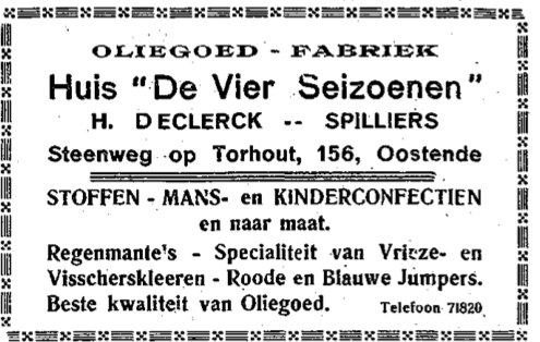Trefwoorden ADVERTENTIES ; KLEDING DE VIER SEIZOENEN (KLEDING) H. DECLERCK-SPILLIERS (HANDELAARS) HANDEL ; KLEDING HANDEL ; VISSERSKLEDING Plaatskenmerk O.D.P.-archieven. Bibliotheek Kris Lambert VISS1945 01-12-1912 Bron Het Nieuw Visscherijblad Pagina's 6 Print
