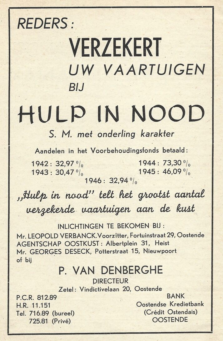 Reders verzekert uw vaartuigen bij Hulp in Nood. S.M. met onderling karakter. Inlichtingen te bekomen bij : Mr. Leopold Verbanck. Voorziter, Fortuinstraat 29, Oostende. Agentschap Oostkust : Albertplein 31, Heist. Mr. Georges Deseck, Potterstraat 15, Nieuwpoort of bij P. Van Denberghe. Directeur. Zetel : Vindicitivelaan 20, Oostende.