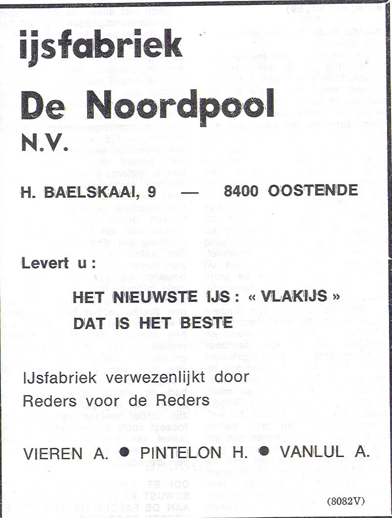 Ijsfabriek De Noordpool nv, H. Baelskaai 9, 8400 Oostende. Levert u : Het nieuwste ijs : "vlakijs". Dat is het beste. Ijsfabriek verwezenlijkt door reders voor de reders. Vieren A., Pintelon H., Vanlul A.
