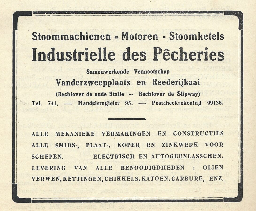 Stoommachienen. Motoren. Stoomketels. Alle mekanieke vermakingen en constructies. Alle smids-, plaat-, koper en zinkwerk voor schepen. Electrisch en autogeenlasschen. Levering van alle benoodigdheden : oliën, verven, kettingen, chikkels, katoen, carbure, enz.