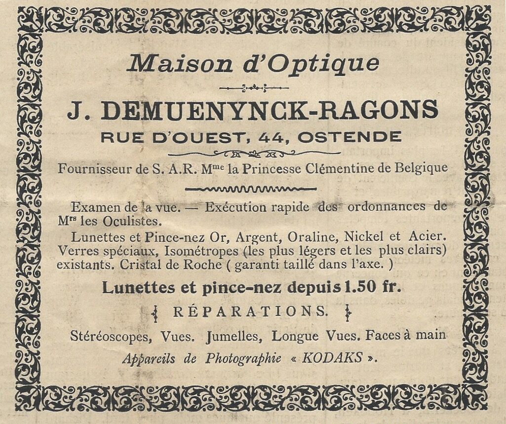 Fournisseur de S.A.R. Mme la Princesse Clémentine de Belgique. Examen de la vue. Exécution rapide des ordonnances de Mrs les oculistes. Lunettes et pince-nez or, argent, oraline, nickel et acier. Verres spéciaux, isométropes (les plus légers et les plus clairs) existans, cristal de roche (garanti taillé dans l'axe). Lunettes et pince-nez depuis 1.50 fr. - Réparations - Stéréoscopes, vues, jumelles, longue vues, face à main. Appareils de photographie "KODAKS"
