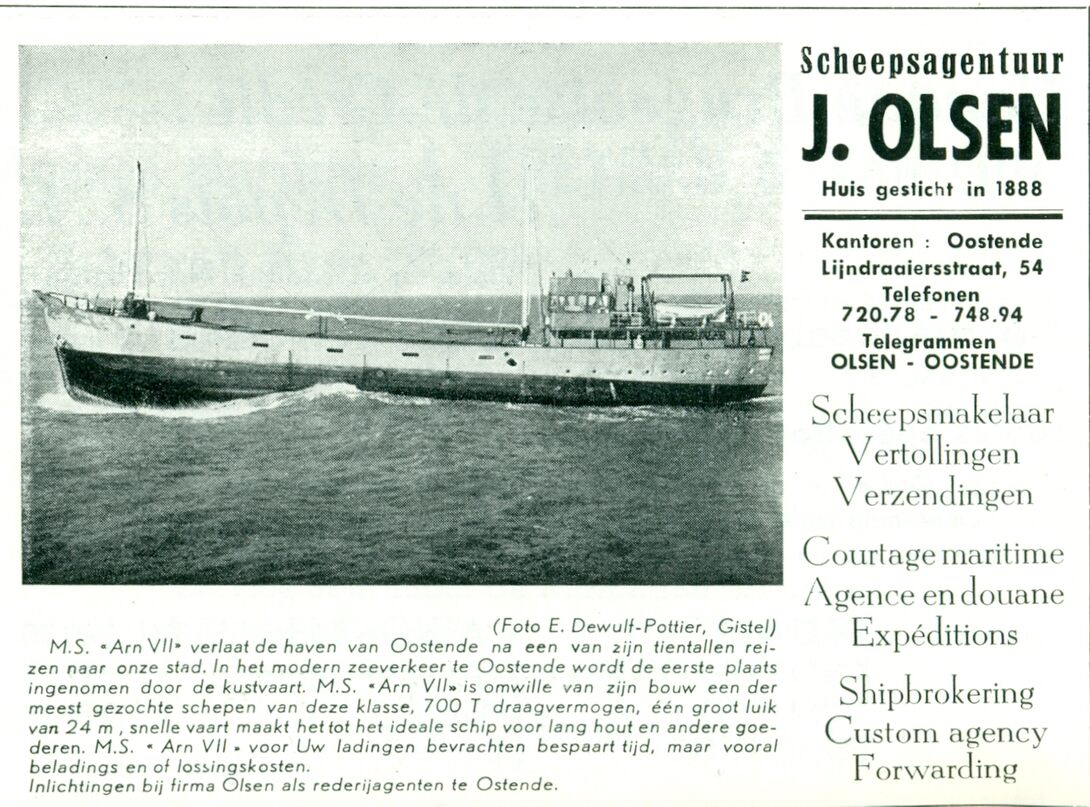 Scheepsmakerlaar - Vertollingen - Verzendingen - Courtage maritime - Agence en douane - Expéditions - Shipbrokering - Custom agency - Forwarding. Foto : Het vrachtschip "Arn VII" verlaat de haven van Oostende