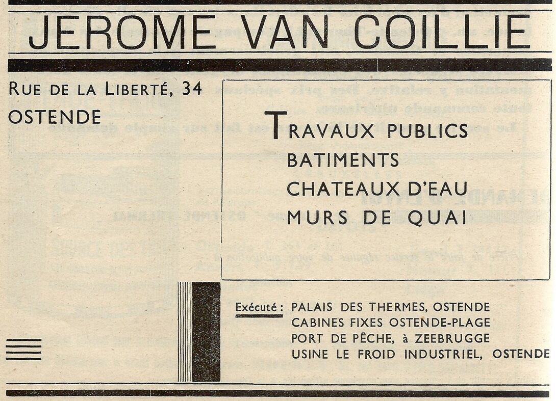 Exécuté : Palais des Thermes, Ostende. Cabines fixes Ostende-Plage. Port de Pêche, à Zeebrugge. Usine le Froid Industriel, Ostende