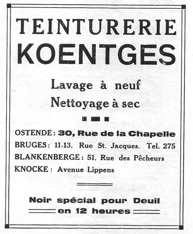 Lavage à neuf. Nettoyage à sec. - Noir spécial pour deuil en 12 heures. - Ook vestigingen te : 11-13, Rue St. Jacques, Bruges. 51, Rue des Pêcheurs, Blankenberge. Avenue Lippens, Knocke.