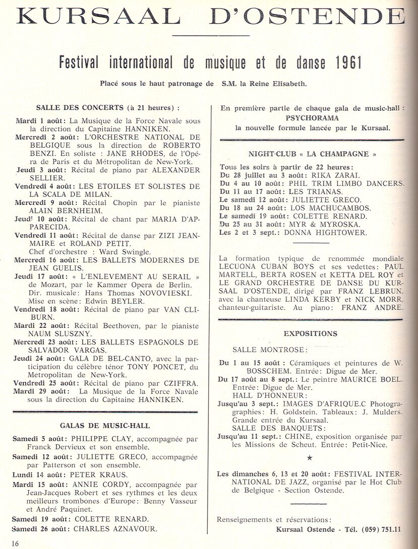 Trefwoorden ADVERTENTIES ; EVENEMENTEN CASINO-KURSAAL ; PROGRAMMA'S Plaatskenmerk OSTE1961 augustus 1961 Auteurs Anoniem Volume 4 Nummer 8 Bron Ostend Flash Pagina's 16 Print