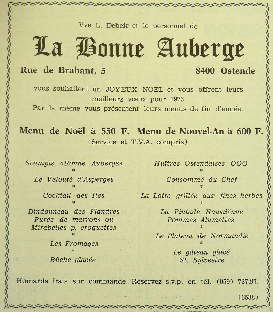 Omschrijving Zaakvoerdster : Weduwe L. Debeir Trefwoorden ADVERTENTIES ; HORECA LA BONNE AUBERGE (HOTEL RESTAURANT) BRABANTSTRAAT MENU'S GASTRONOMIE Plaatskenmerk ARCHIEF 117.8 B35 COUR1972 15-12-1972 Auteurs Anoniem Bron Le Courrier du Littoral Pagina's 11 Print