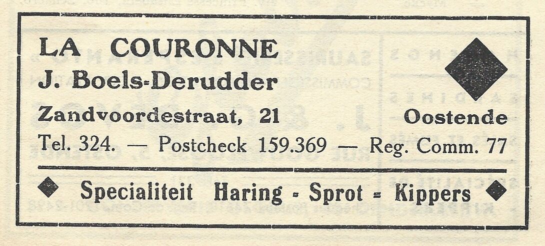 Advertentie : La Couronne. J. Boels-Derudder. Zandvoordestraat 21, Oostende