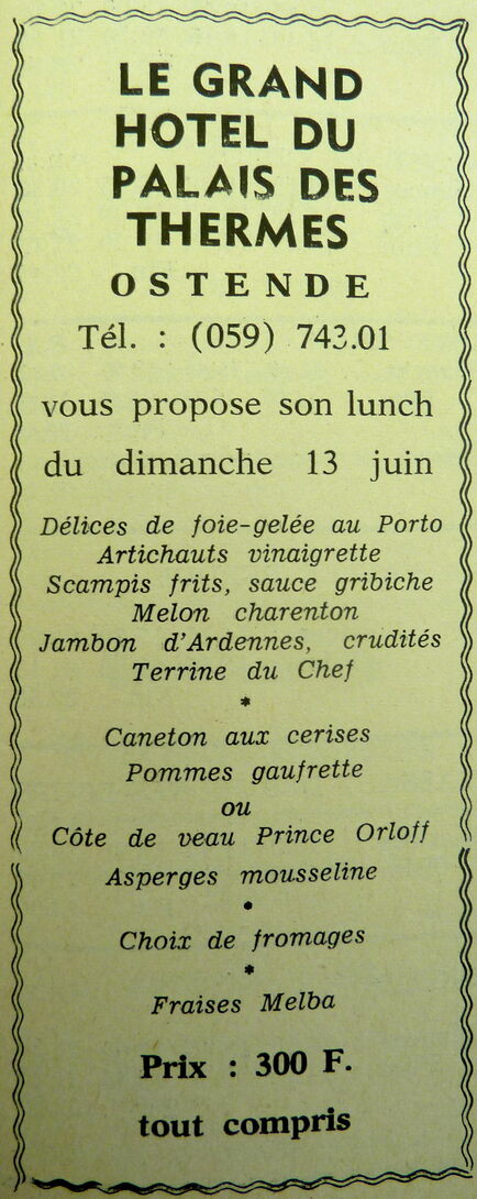 Trefwoorden ADVERTENTIES ; HORECA GRAND HOTEL DU PALAIS DES THERMES MENU'S GASTRONOMIE Plaatskenmerk ARCHIEF 117.8 B35 COUR1971 11-06-1971 Auteurs Anoniem Bron Le Courrier du Littoral Pagina's 7 Print