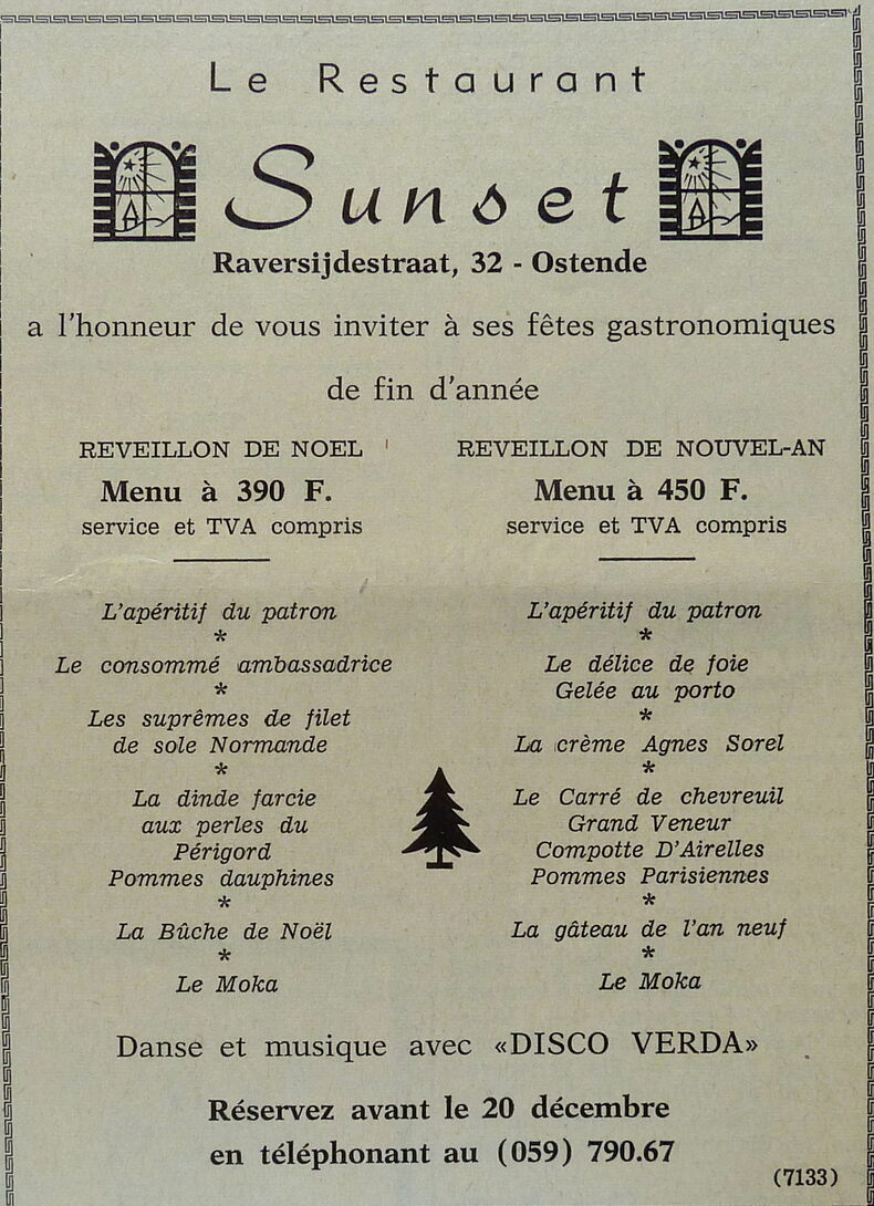 Trefwoorden ADVERTENTIES ; HORECA GASTRONOMIE SUNSET (RESTAURANT) MENU'S RAVERSIJDESTRAAT Plaatskenmerk ARCHIEF 117.8 B35 COUR1973 14-12-1973 Bron Le Courrier du Littoral Pagina's 5 Print