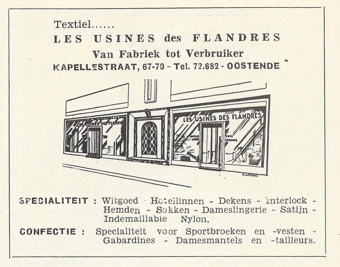 Advertentie : Les Usines des Flandres. Textiel. Kapellestraat 67-70, Oostende