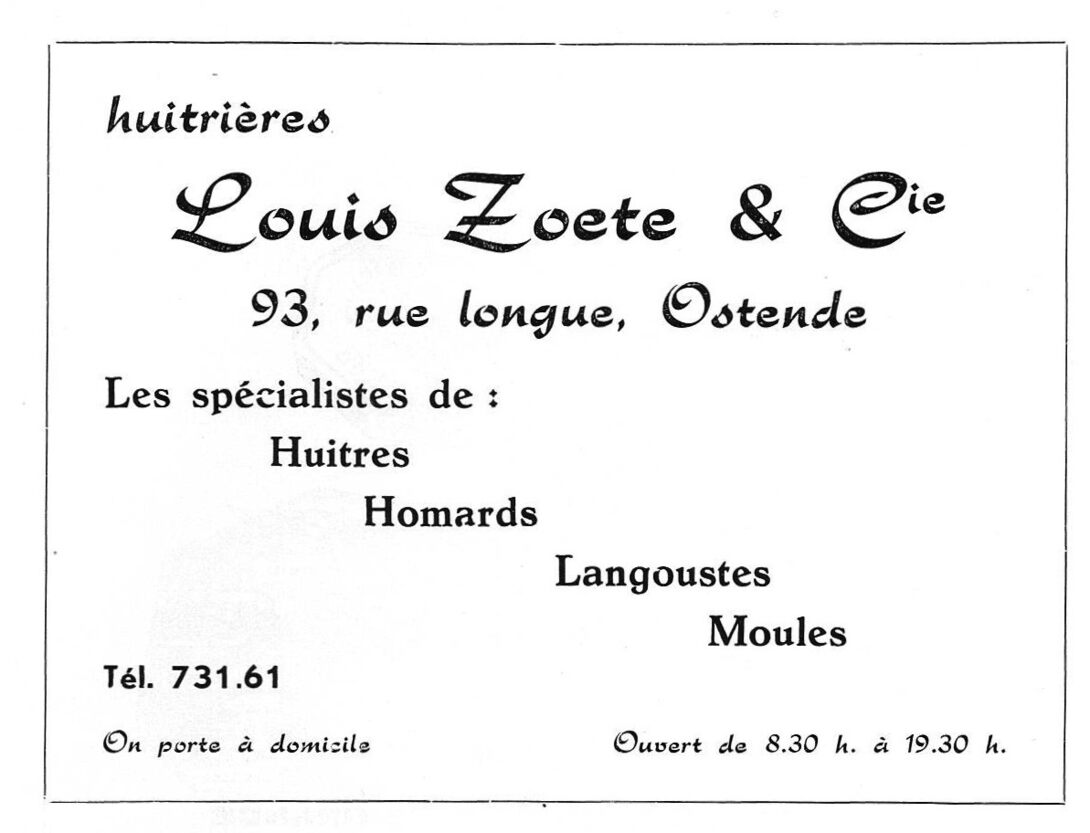 Les spécialistes de : Huitres. Homards. Langoustes. Moules. On porte à domicile. Ouvert de 8.30 h. à 19.30 h.