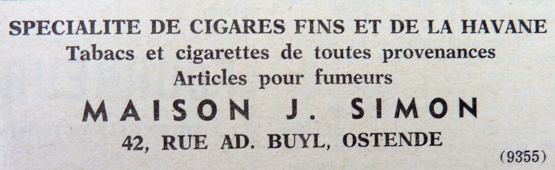 Omschrijving Spécialité de cigares fins et de la Havane. Tabacs et cigarettes de toutes provenances. Articles pour fumeurs Trefwoorden ADVERTENTIES ; HANDEL MAISON J. SIMON (TABAK SIGAREN) ADOLF BUYLSTRAAT Plaatskenmerk ARCHIEF 117.8 B35 COUR1965 17-12-1965 Auteurs Anoniem Bron Le Courrier du Littoral Pagina's 4 Print