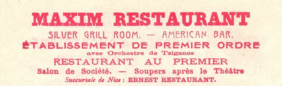 Silver Grill Room. American Bar. Etablissement de premier ordre avec Orchestre de Tziganes. Restaurant au premier. Salon de Société. Soupers après le Théâtre. Succursale de Nice : Ernest Restaurant. - Was gelegen op de hoek van de Van Iseghemlaan en de Langestraat. Nu, 2020, het toerismebureau. - Map 015 D-16