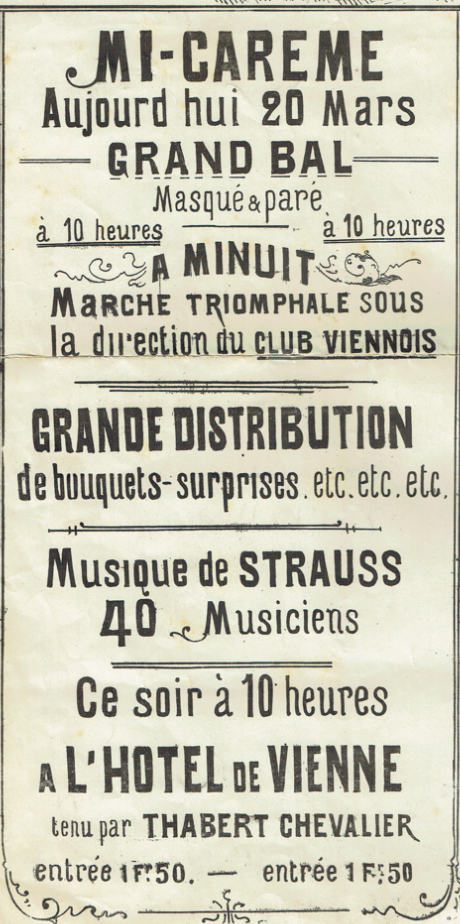 Advertentie : Mi-Carême. Grand bal. Hôtel de Vienne. 20/03/1887