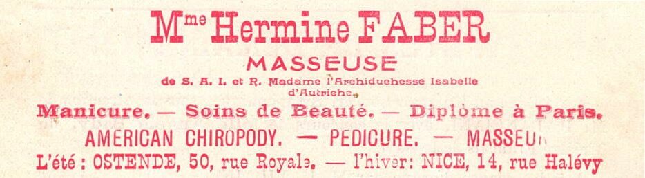 l'Hiver : Nice, 14, rue Halévy. Masseuse de S.A.I. et R. Madame l'Archiduchesse Isabelle d'Autriche. Manicure, Soins de Beauté, Diplôme à Paris. American Chiropody, Pédicure, Masseur. - Map 015 D-16
