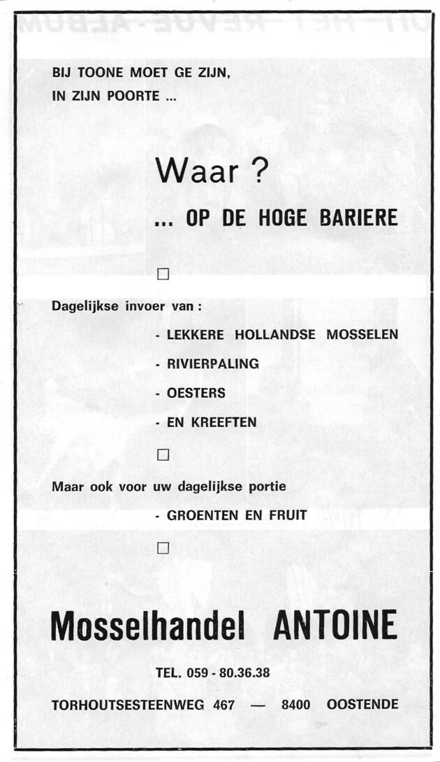 Trefwoorden ADVERTENTIES ; HANDEL IN SCHELP- EN SCHAALDIEREN ANTOINE (MOSSELHANDEL) TORHOUTSESTEENWEG Inventarisnummers 2013/1916 Deelbeschrijving uit boek of document Programma : Vergit da mo 1978 Pagina 29 Print
