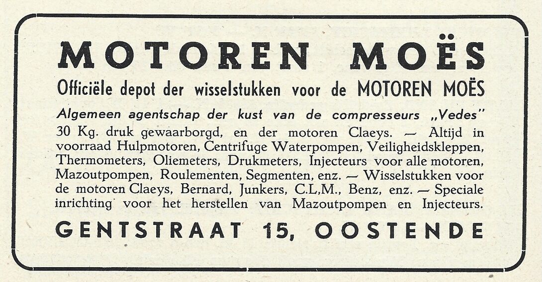 Officiële depot der wisselstukken voor de motoren Moës. Algemeen agentschap der kust van de compresseurs "Vedes". 30 kg. druk gewaarborgd en der motoren Claeys. Altijd in voorraad hulpmotoren, centrifuge waterpompen, veiligheidskleppen, thermometers, oliemeters, drukmeters, injecteurs voor alle motoren, mazoutpompen, roulementen, segmenten, enz. - Wisselstukken voor de motoren Claeys, Bernard, Junkers, C.L.M., Benz, enz. - Speciale inrichting voor het herstellen van mazoutpompen en injecteurs.
