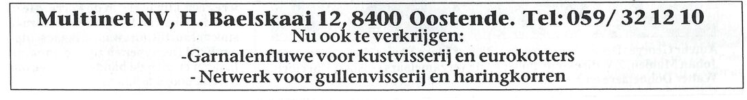 Advertentie : Multinet nv, H. Baelskaai 12, 8400 Oostende, tel 059 / 32 12 10. - Nu ook te verkrijgen : Garnalenfluwe voor kustvisserij en eurokotters. - Netwerk voor gullenvisserij en haringkorren