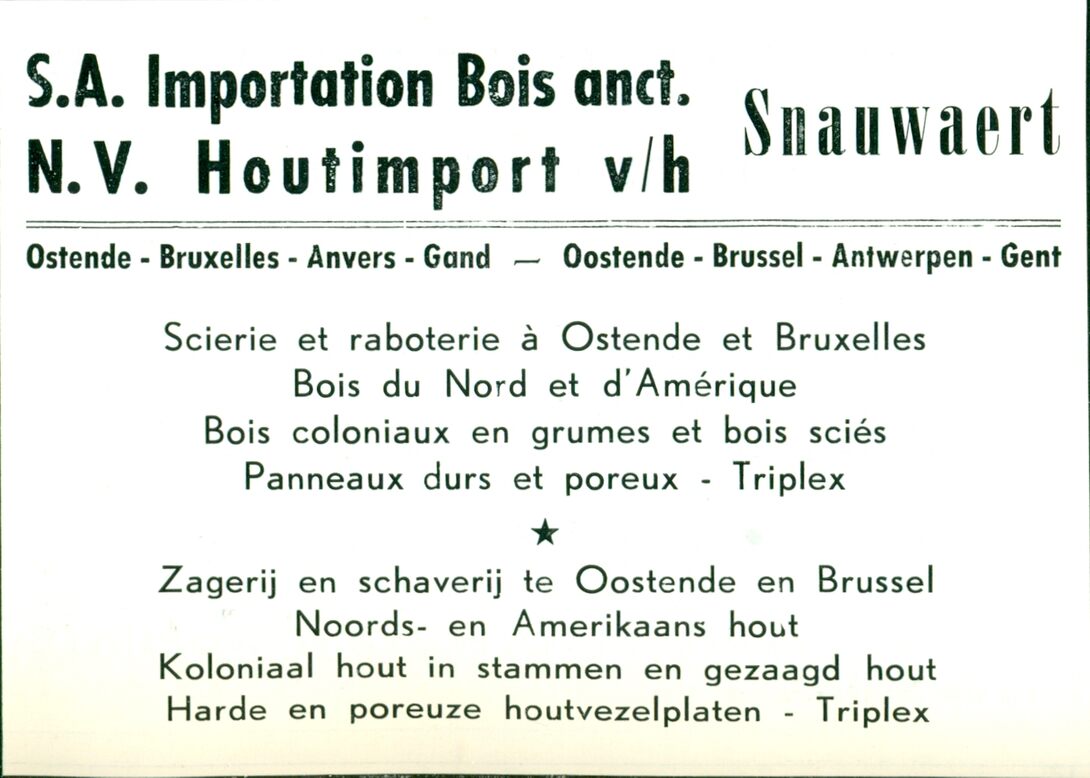 Opgericht in 1941 door overneming en ter voortzetting van de Société Commerciale et Immobilière J. & C. Snauwaert, welke ontstaan is uit de in 1887 gestichte firma De Fever en Snauwaert. De vennootschap heeft vestigingen te Oostende, Brussel, Antwerpen en Gent. Zij beschikt over een zagerij en schaverij te Oostende en te Brussel, en importeert Noords- Amerikaans- en Kongolees hout, hoofdzakelijk bedoeld voor verkoop op de binnenlandse markt. Koloniaal hout, in stammen gezaagd, wordt ook uitgevoerd. De firma telt 43 eenheden personeel. In : Dit is West-Vlaanderen : steden, gemeenten, bevolking : dl.2 / Lucien Dendooven. Flandria, 1960. p.1278
