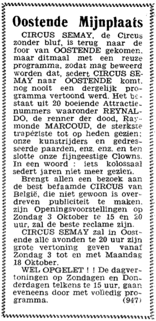 Trefwoorden ADVERTENTIES ; CIRCUSSEN CIRCUS SEMAY MIJNPLEIN OKTOBERFOOR CIRCUSSEN Plaatskenmerk O.D.P.-archieven. Bibliotheek Kris Lambert VISS1948 01-10-1948 Bron Het Nieuw Visscherijblad Pagina's 8 Print
