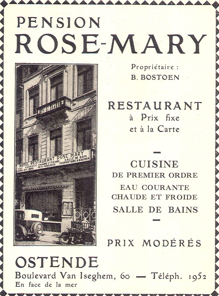 Propriétaire : B. Bostoen. Restaurant à prix fixe et à la carte. Cuisine de premier ordre. Eau courante chaude et froide. Salle de bains. Prix modérés