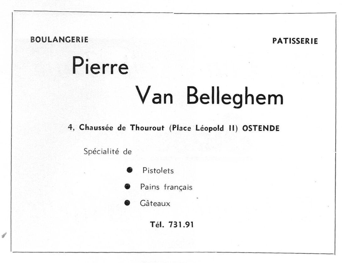 Advertentie : Pierre Van Belleghem. Boulangerie - Pâtisserie. 4, Chaussée de Thourout (Place Leopold II), Ostende