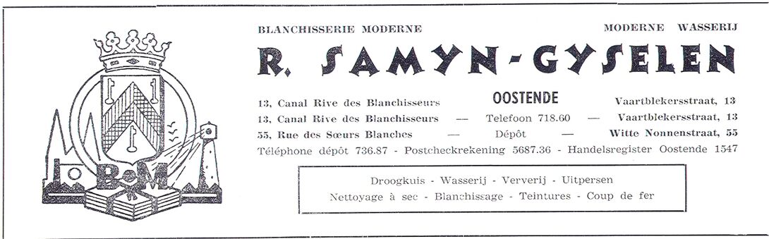 Moderne Wasserij, Raymond Samyn-Gyselen. De oorsprong van dit bedrijf gaat terug tot 1761, toen Jacobus Samyn een blekerij oprichtte. De zaak ging over van vader op zoon en kwam in 1870 in handen van Frans Samyn, die overschakelde van blekerij naar stoomwasserij. Het bedrijf werd geïndustrialiseerd toen Oscar Samyn de leiding ervan gedurende de Eerste Wereldoorlog overnam. Raymond Samyn, die sedert 1956 aan het hoofd van de zaak staat, voegde er een chemische wasserij aan toe. Aan de inrichting is tevens een mechanische strijkerij en een speciale afdeling voor hemden verbonden. Het personeel tel in het zomerseizoen 75 leden, 's winters 35 à 40. Het cliënteel van de "Moderne Wasserij" bestaat hoofdzakelijk uit hotels en homes en is verspreid over het ganse kustgebied van Blankenberge tot De Panne. In : Dit is West-Vlaanderen : steden, gemeenten, bevolking : dl.2 / Lucien Dendooven. Flandria 1963. p. 1299