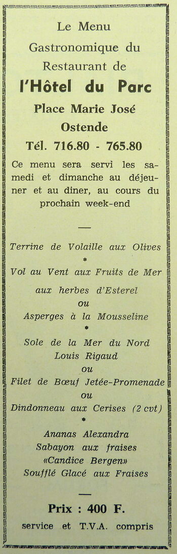 Trefwoorden ADVERTENTIES ; HORECA HOTEL DU PARC (HOTEL CAFE) MENU'S GASTRONOMIE Plaatskenmerk ARCHIEF 117.8 B35 COUR1971 04-06-1971 Auteurs Anoniem Bron Le Courrier du Littoral Pagina's 7 Print