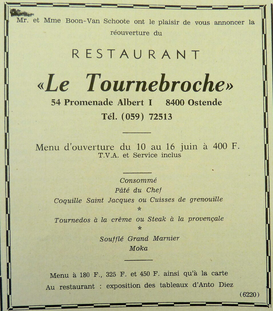 Omschrijving Zaakvoerders de heer en mevrouw Boon-Van Schoote. Trefwoorden ADVERTENTIES ; HORECA LE TOURNEBROCHE (RESTAURANT) ALBERT I PROMENADE RESTAURANTS BOON-VAN SCHOOTE (RESTAURANTHOUDERS) MENU'S Plaatskenmerk ARCHIEF 117.8 B35 COUR1972 09-06-1972 Auteurs Anoniem Bron Le Courrier du Littoral Pagina's 4 Print