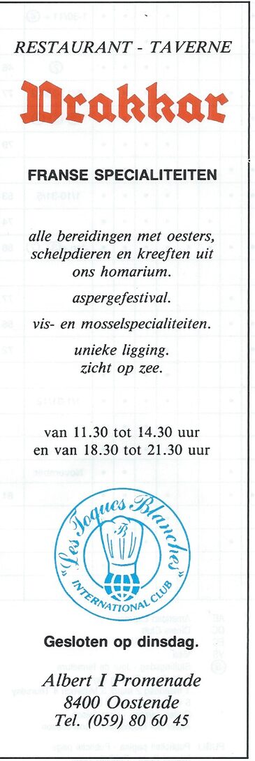 Trefwoorden ADVERTENTIES ; HORECA DRAKKAR (RESTAURANT TAVERNE) ALBERT I PROMENADE Plaatskenmerk A334 Deelbeschrijving uit boek of document Oostende 88 1987 Pagina 77 Print