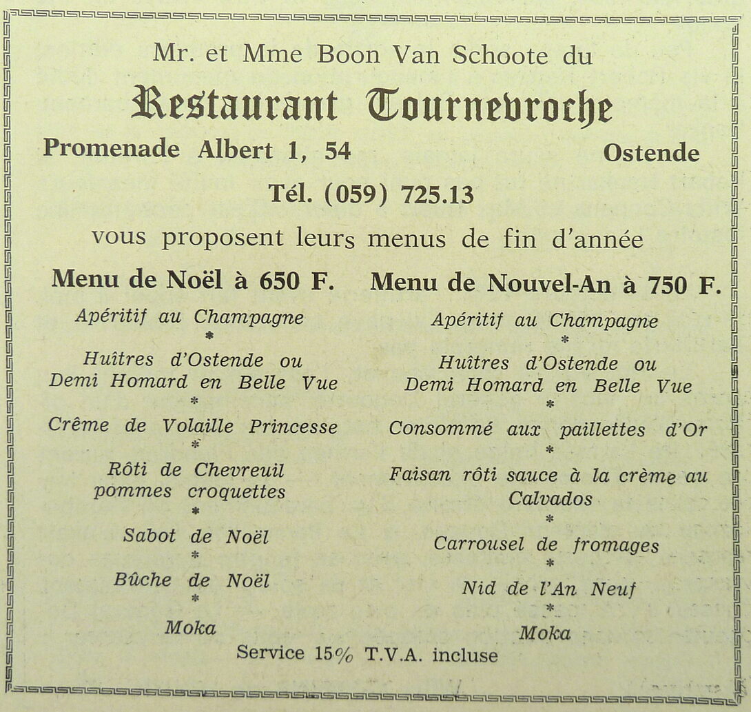 Omschrijving Zaakvoerders de heer en mevrouw Boon-Van Schoote Trefwoorden ADVERTENTIES ; HORECA LE TOURNEBROCHE (RESTAURANT) ALBERT I PROMENADE MENU'S GASTRONOMIE BOON-VAN SCHOOTE (RESTAURANTHOUDERS) Plaatskenmerk ARCHIEF 117.8 B35 COUR1972 15-12-1972 Auteurs Anoniem Bron Le Courrier du Littoral Pagina's 11 Print