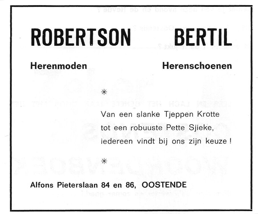 Trefwoorden ADVERTENTIES ; KLEDING ROBERTSON BERTIL (KLEDING) ALFONS PIETERSLAAN HANDEL ; KLEDING SCHOENEN Plaatskenmerk MUSEUMDEPOT 117.7 A16 D1/1981 Deelbeschrijving uit boek of document Programma : 't Is doa da 't jukt 1981 Pagina 38 Print