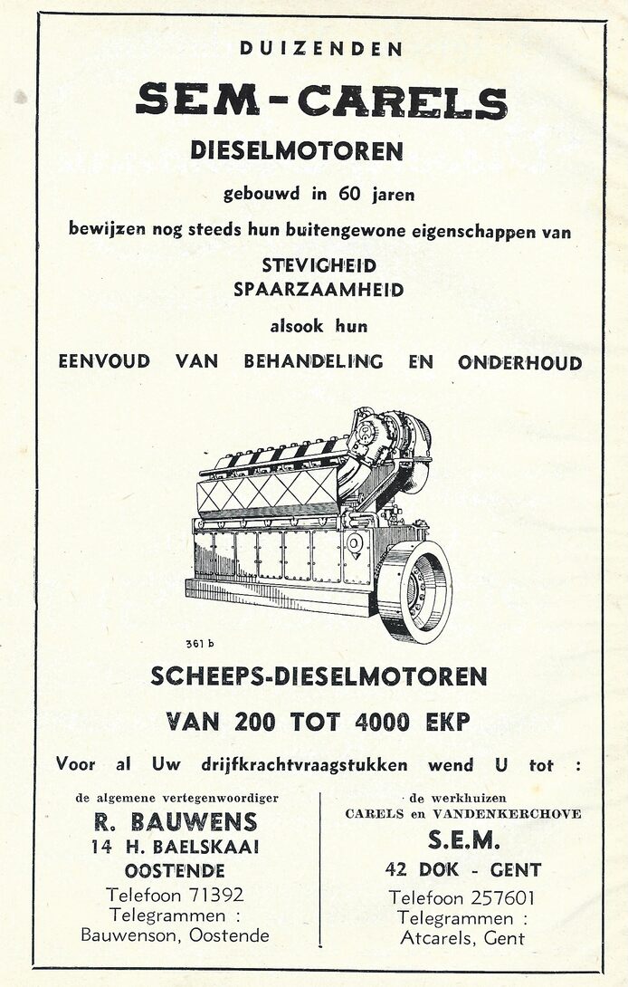 Duizenden SEM-CARELS dieselmotoren gebouwd in 60 jaren bewijzen nog steeds hun buitengewone eigenschappen van stevigheid, spaarzaamheid alsook hun eenvoud van behandeling en onderhoud. Scheeps-dieselmotoren van 200 tot 4000 ekp. Voor al uw drijfkrachtvraagstukken wend u tot : de algemene vertegenwoordiger R. Bauwens, 14 H. Baelskaai, Oostende. De werkhuizen Carels en Vandenkerchove SEM, 42 Dok, Gent