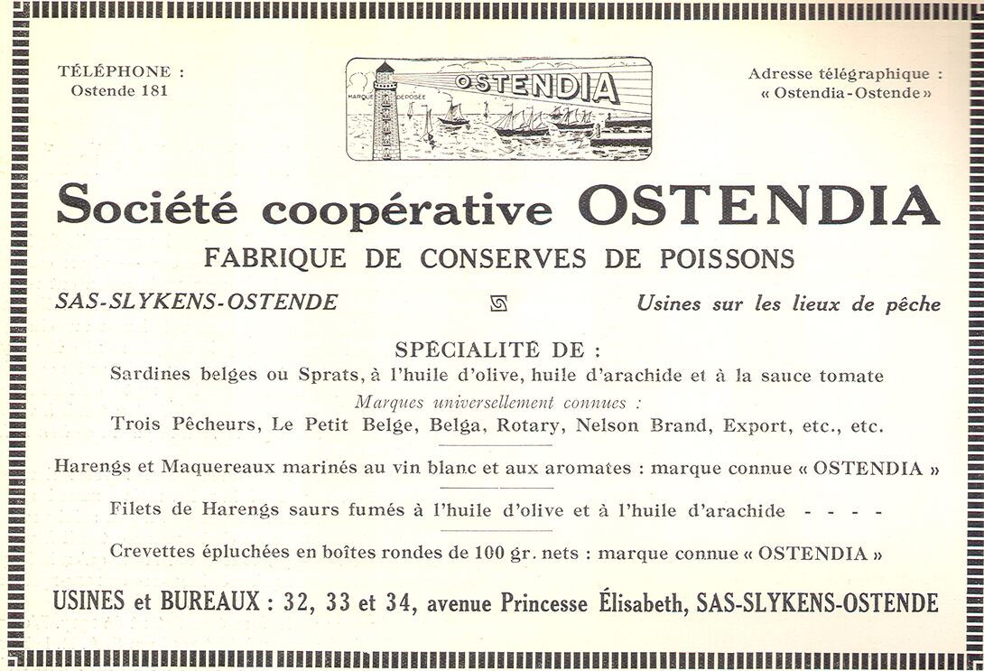 Advertentie : Société coopérative Ostendia. Fabrique de conserves de poissons. Prinses Elisabethlaan 32-34, Bredene