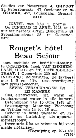 Trefwoorden ADVERTENTIES ; VERKOPINGEN ROUGETS HOTEL BEAU SEJOUR VAN ISEGHEMLAAN SINT-PETERBURGSTRAAT Plaatskenmerk O.D.P.-archieven. Bibliotheek Kris Lambert VISS1948 09-04-1948 Bron Het Nieuw Visscherijblad Pagina's 9 Print