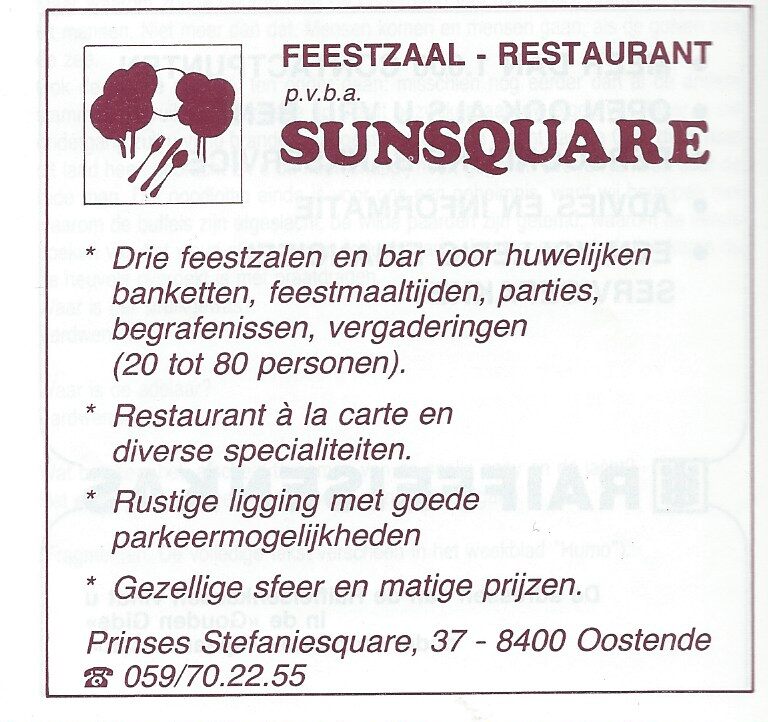 Advertentie : Sunsquare. Feestzaal - Restaurant. Prinses Stefanieplein 37, Oostende