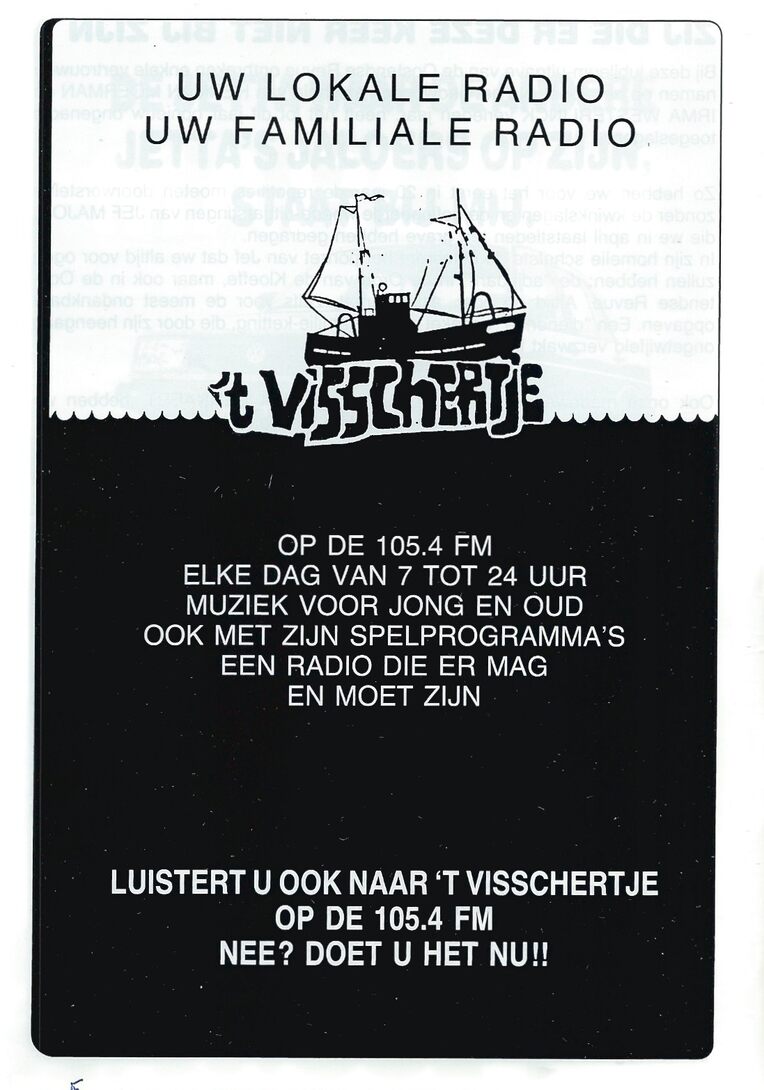 Advertentie : 't Visschertje. Uw lokale radio. Uw familiale radio op de 105.4 FM