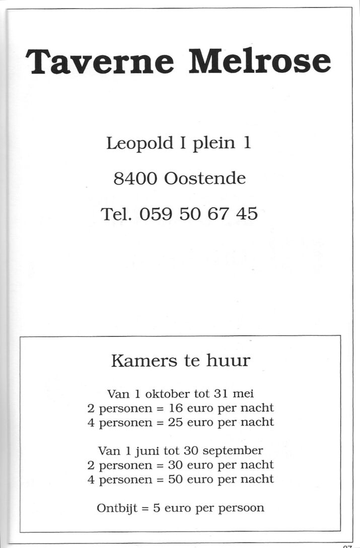 Trefwoorden ADVERTENTIES ; HORECA TAVERNE MELROSE (CAFE) CAFES LEOPOLD I-PLEIN Plaatskenmerk MUSEUMDEPOT 117.7 A14 D2 Deelbeschrijving uit boek of document Programma : Mo gow zeg 2006 Pagina 97 Print