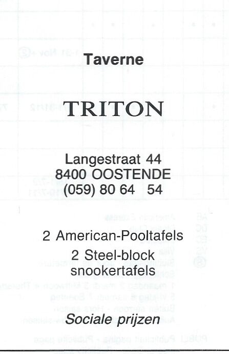 Trefwoorden ADVERTENTIES ; HORECA CAFES LANGESTRAAT DE TRITON (TAVERNE SNOOKERZAAL) Plaatskenmerk A334 Deelbeschrijving uit boek of document Oostende 88 1987 Pagina 79 Print