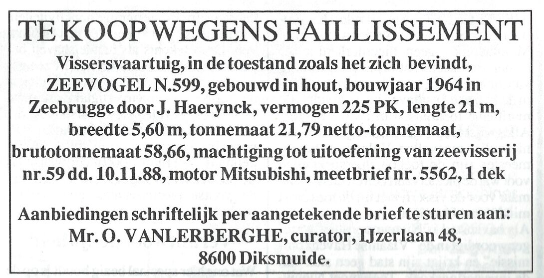 Trefwoorden ADVERTENTIES ; ZEEVISSERIJ N.599 ZEEVOGEL ZEEVISSERIJ ; NIEUWPOORT ZEEVOGEL (VISSERSVAARTUIG) SCHEPEN ; ZEEVOGEL (VISSERSVAARTUIG) HANDEL ; FAILLISSEMENTEN Plaatskenmerk VISS1990 07-12-1990 Auteurs Anoniem Bron Het Visserijblad Pagina's 18 Print