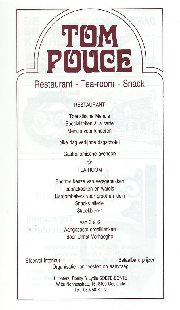 Advertentie : Tom Pouce. Restaurant - Tea-Room - Snack. Wittenonnenstraat 15, Oostende