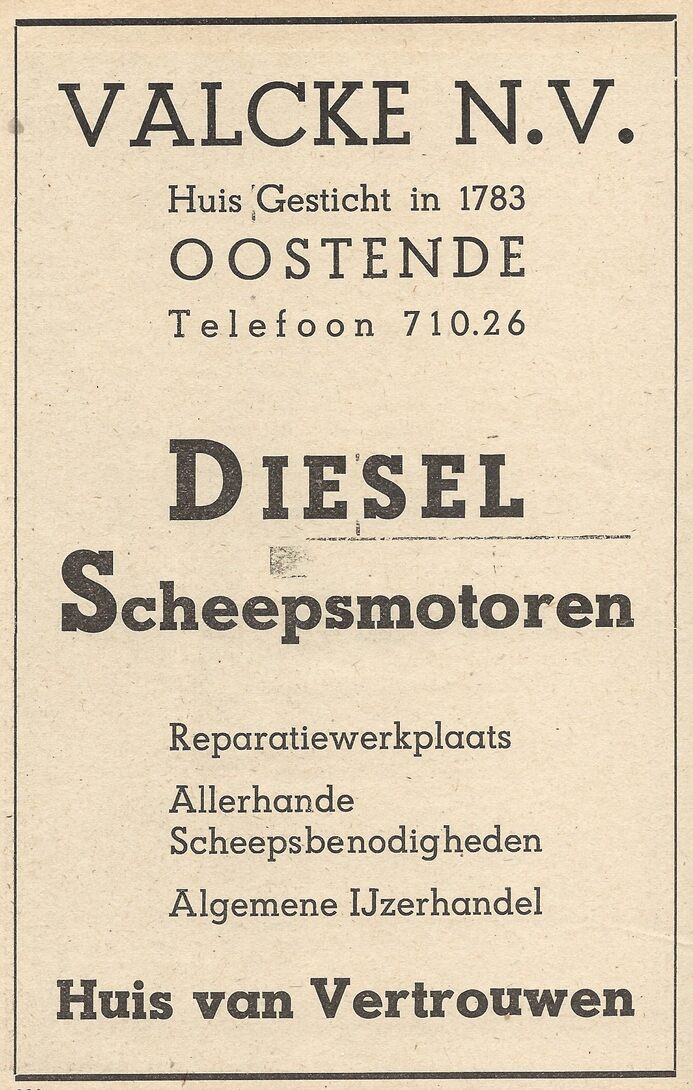 Valcke n.v. Huis gesticht in 1783. Oostende. Diesel scheepsmotoren. Reparatiewerkplaats. Allerhande scheepsbenodigdheden. Algemene ijzerhandel. Huis van vertrouwen