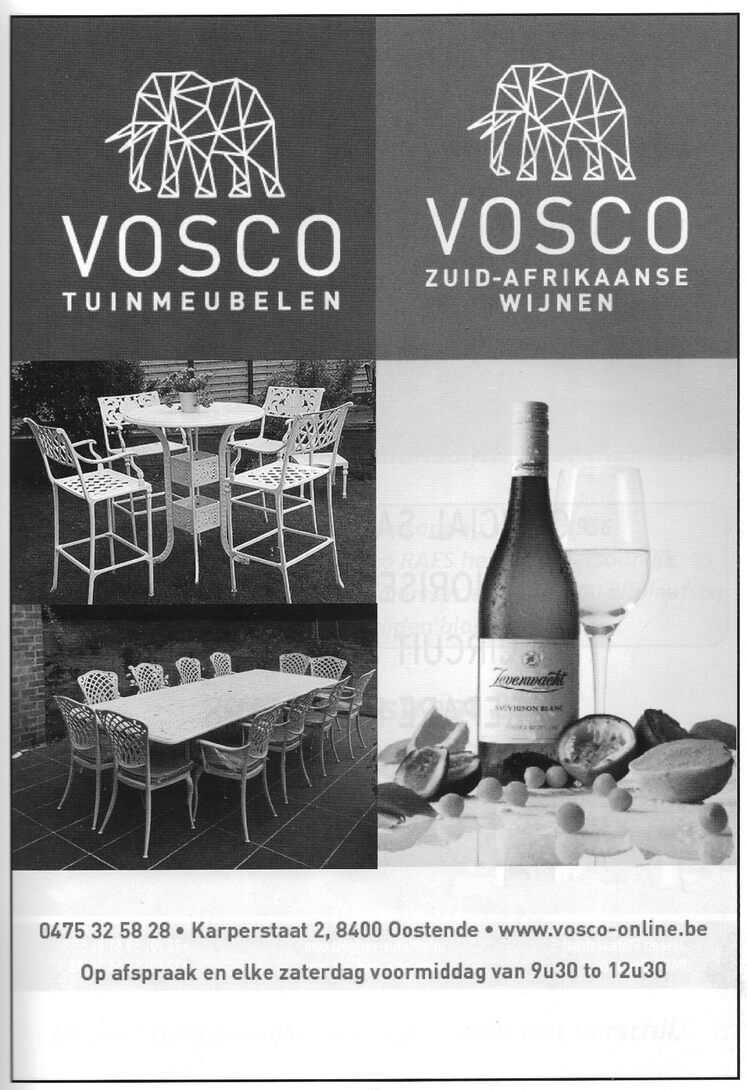 Advertentie : Vosco. Tuinmeubelen - Zuid-Afrikaanse wijnen. Karperstraat 2, Oostende