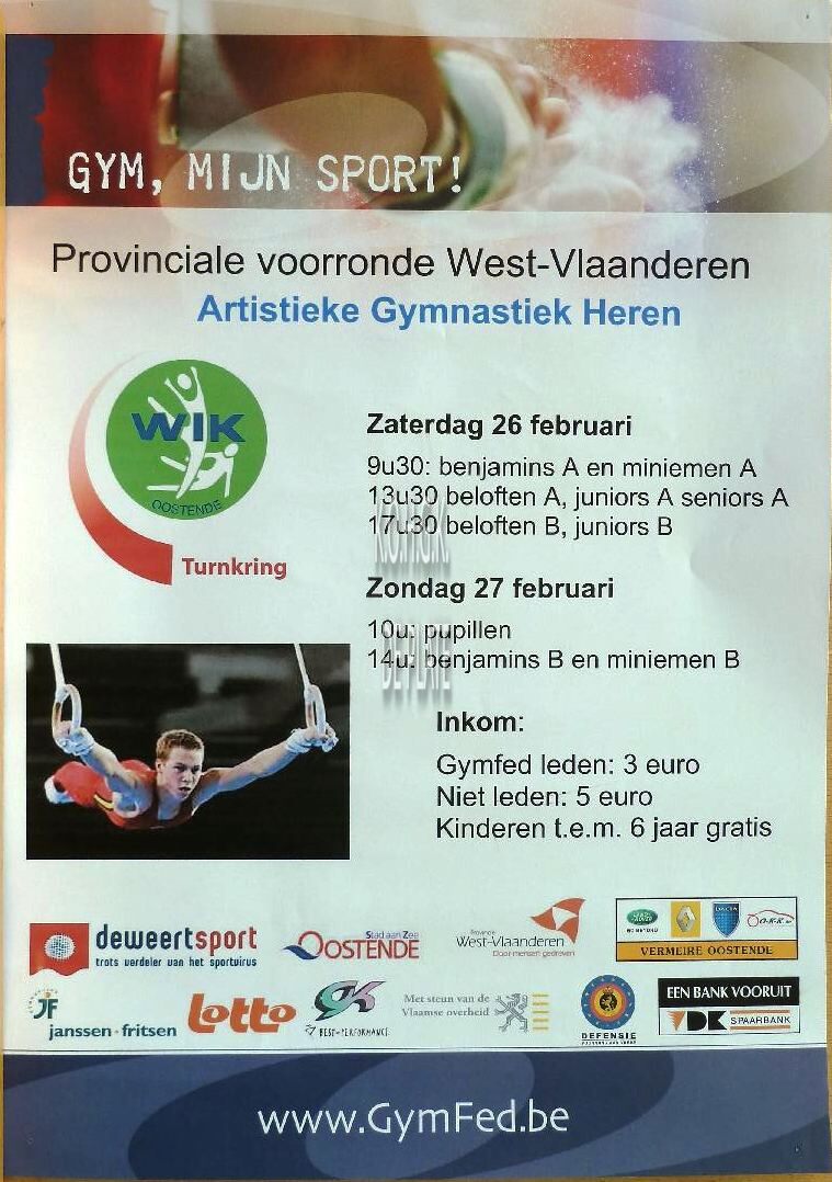Formaat : 42 x 30 cm. Gym, mijn sport!. Zaterdag 26 februari. 9u30: benjamins A en miniemen A. 13u30: beloften A, juniors A, seniors A.17u30: beloften B, juniors B. Zondag 27 februari. 10u: pupillen. 14u: benjamins B en miniemen B. Inkom: Gymfed leden: 3 euro. Niet leden : 5 euro. Kinderen t.e.m. 6 jaar gratis